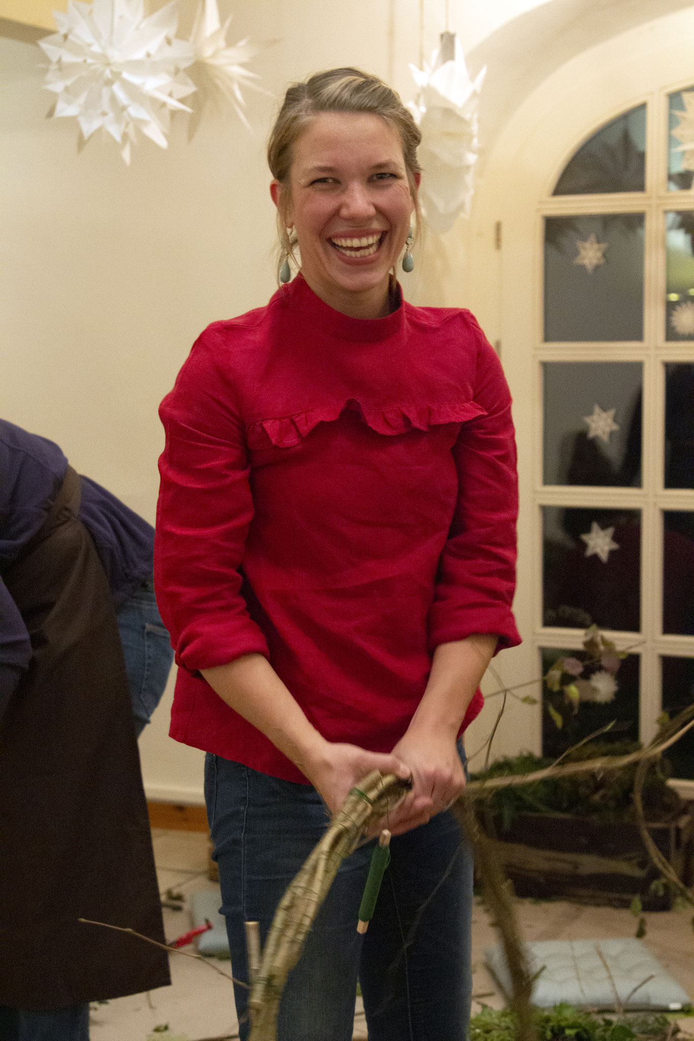 The table in the large fireplace hall is already set. On brown wrapping paper, the handcrafted tools are neatly arranged: red garden shears, binding wire in various thicknesses, and straw rings as bases. The whole room is filled with the scent of fir bundles, a hint of eucalyptus, Mediterranean herbs, and the resin of pine cones. From the Hazelnut House forest, I have brought you some woven, gnarled twigs — and mistletoe from our old orchard. What a potpourri of Christmas aromas! And what a joy it is to work with these treasures from nature.