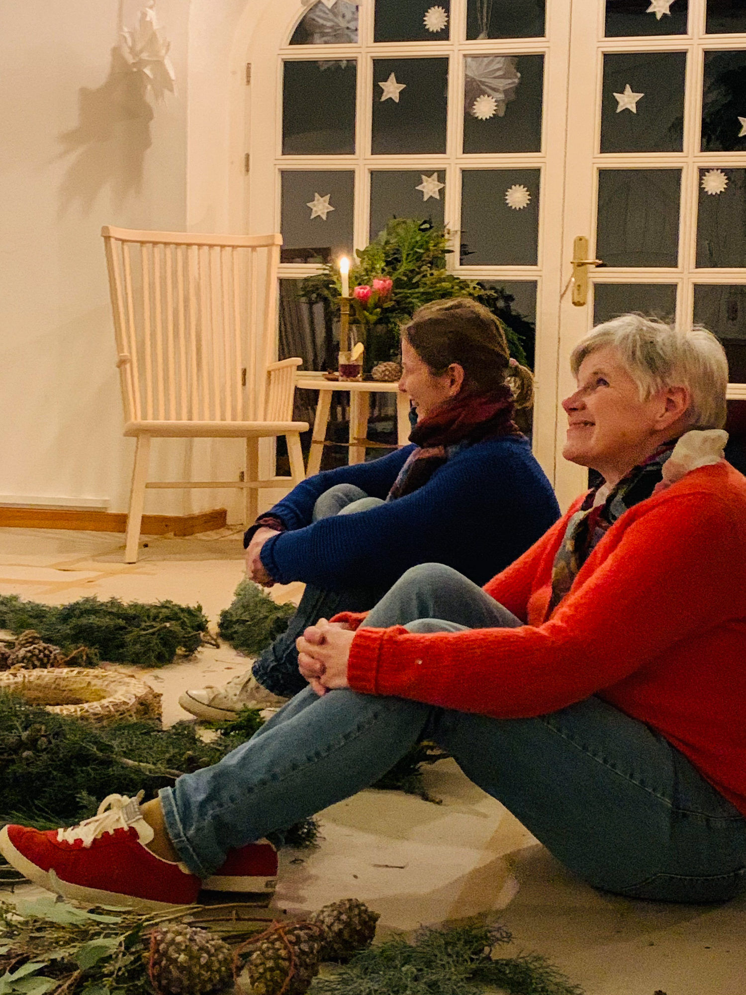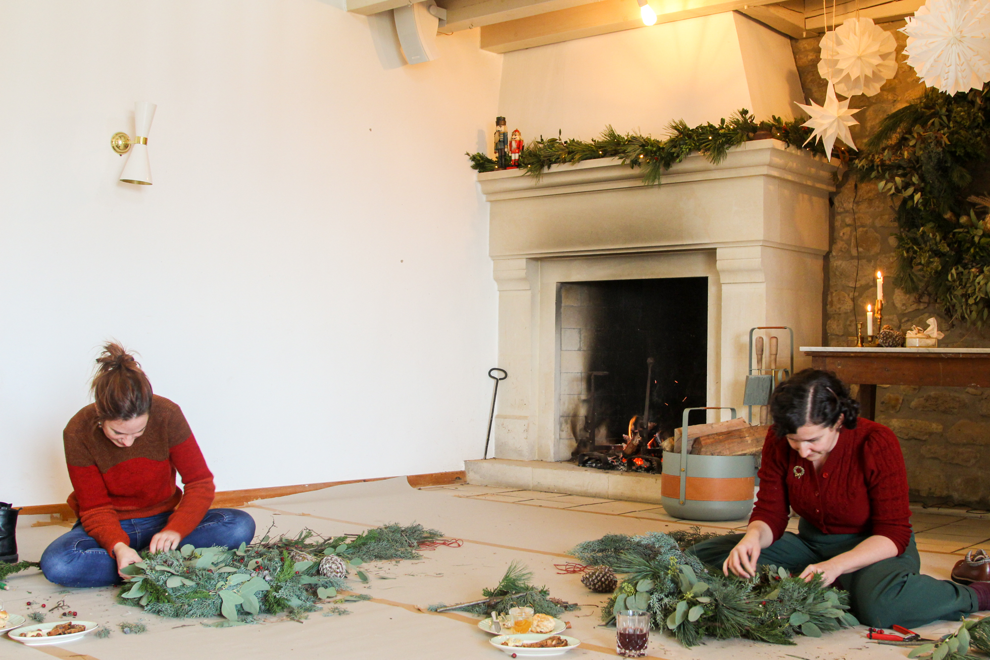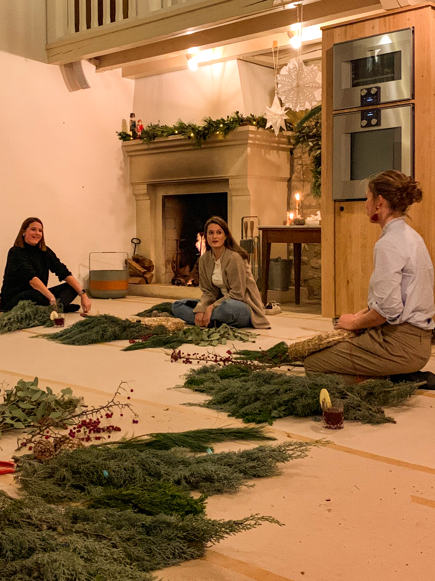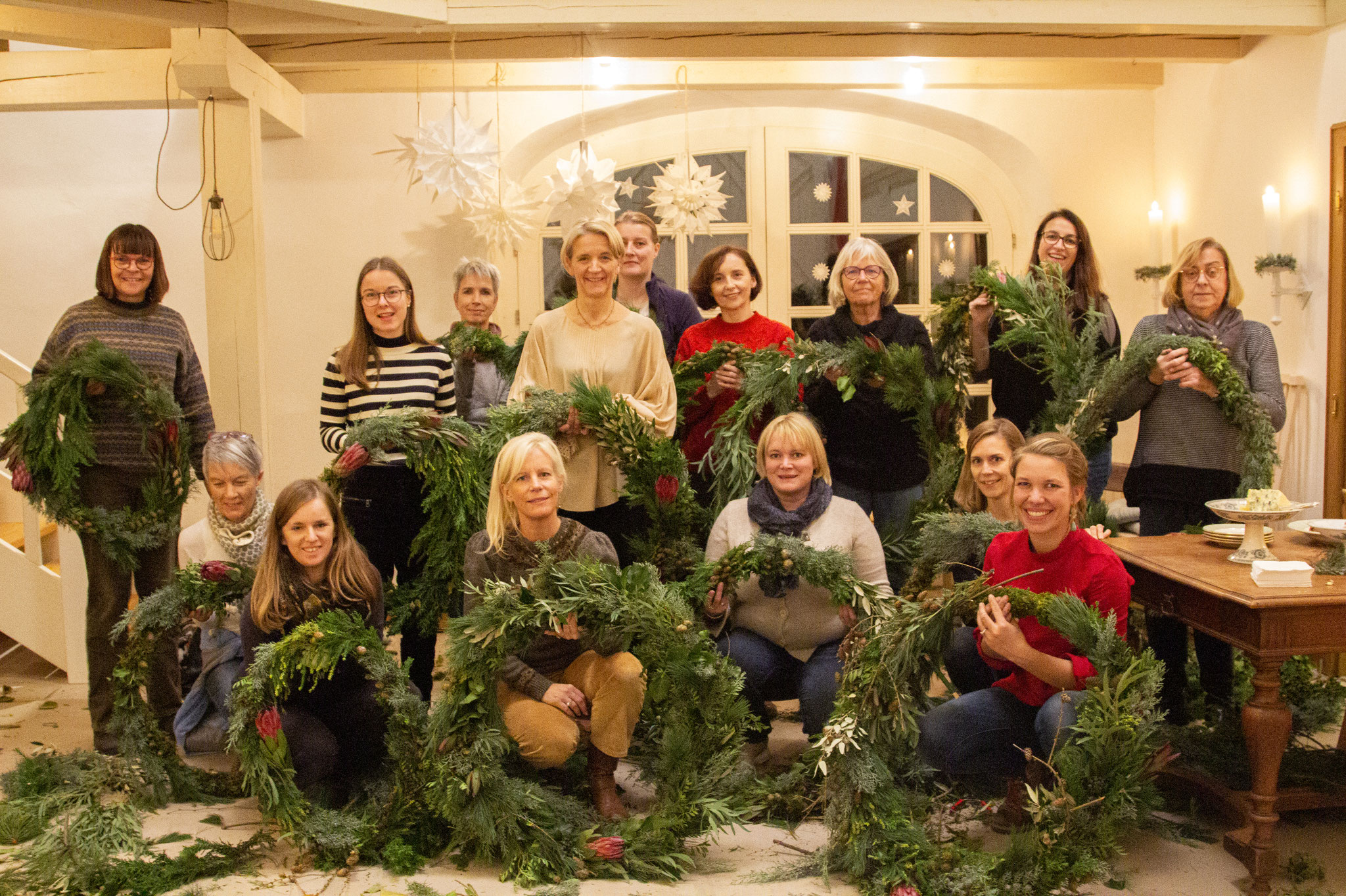 From outside, the laughter of arriving guests drifts in. “Welcome!” I hear myself calling — a favourite word of mine. The fire crackles in the sandstone fireplace, and together we enjoy warm scones with steaming tea. Afterwards, we begin our creations. The combination of different greens, flowers, cones, and even feathers transforms into the most wonderful Christmas wreaths under our hands. Each wreath becomes a unique, enchanting masterpiece.
