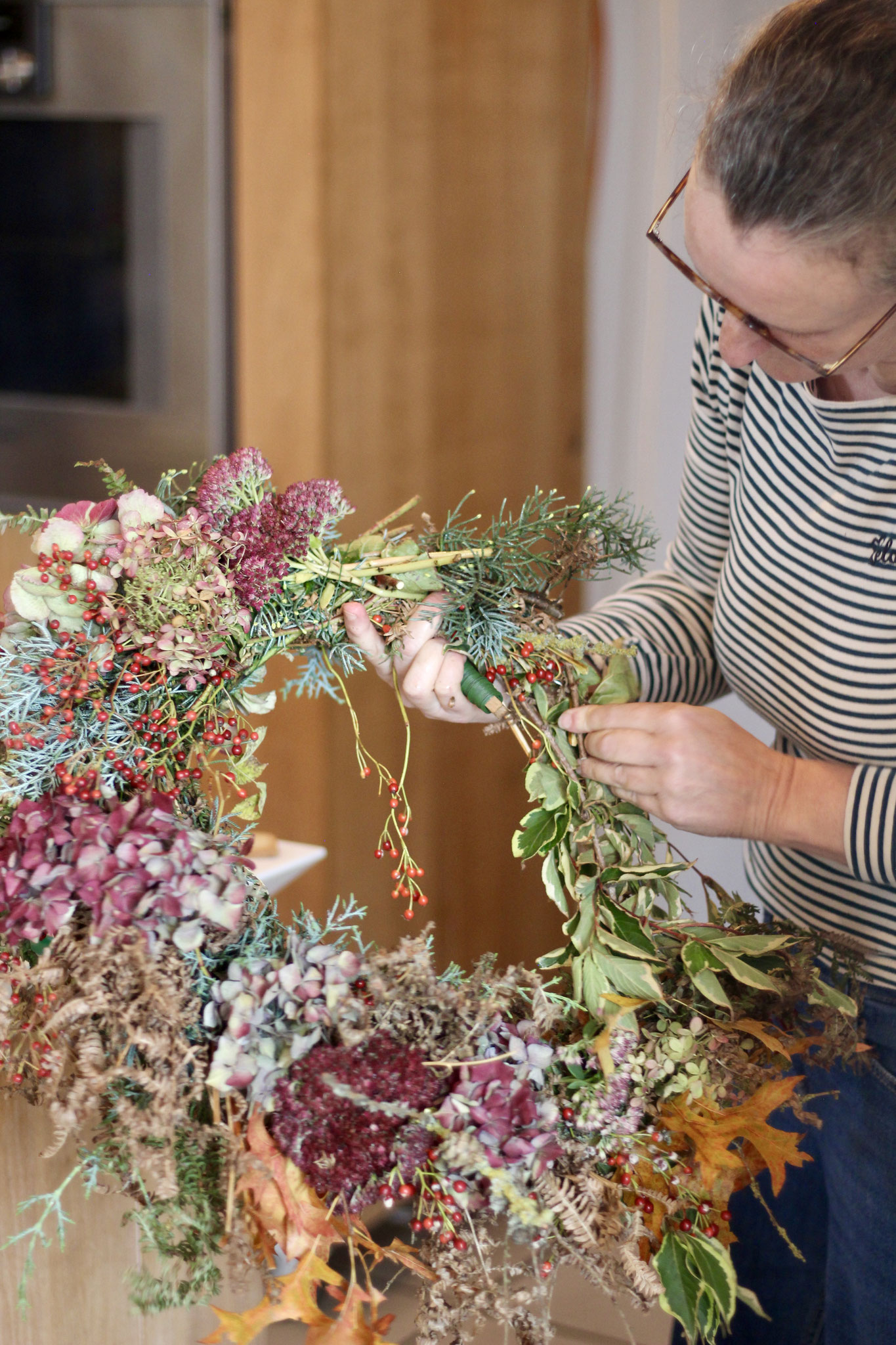 Back at Hazelnut House, the fire is already burning in the open sandstone fireplace — what a heartwarming atmosphere! The stunning colours of autumn make our hearts beat faster. We gather around the long table and learn from Theresa how to craft the wreath of our dreams — for the front door or for our home.